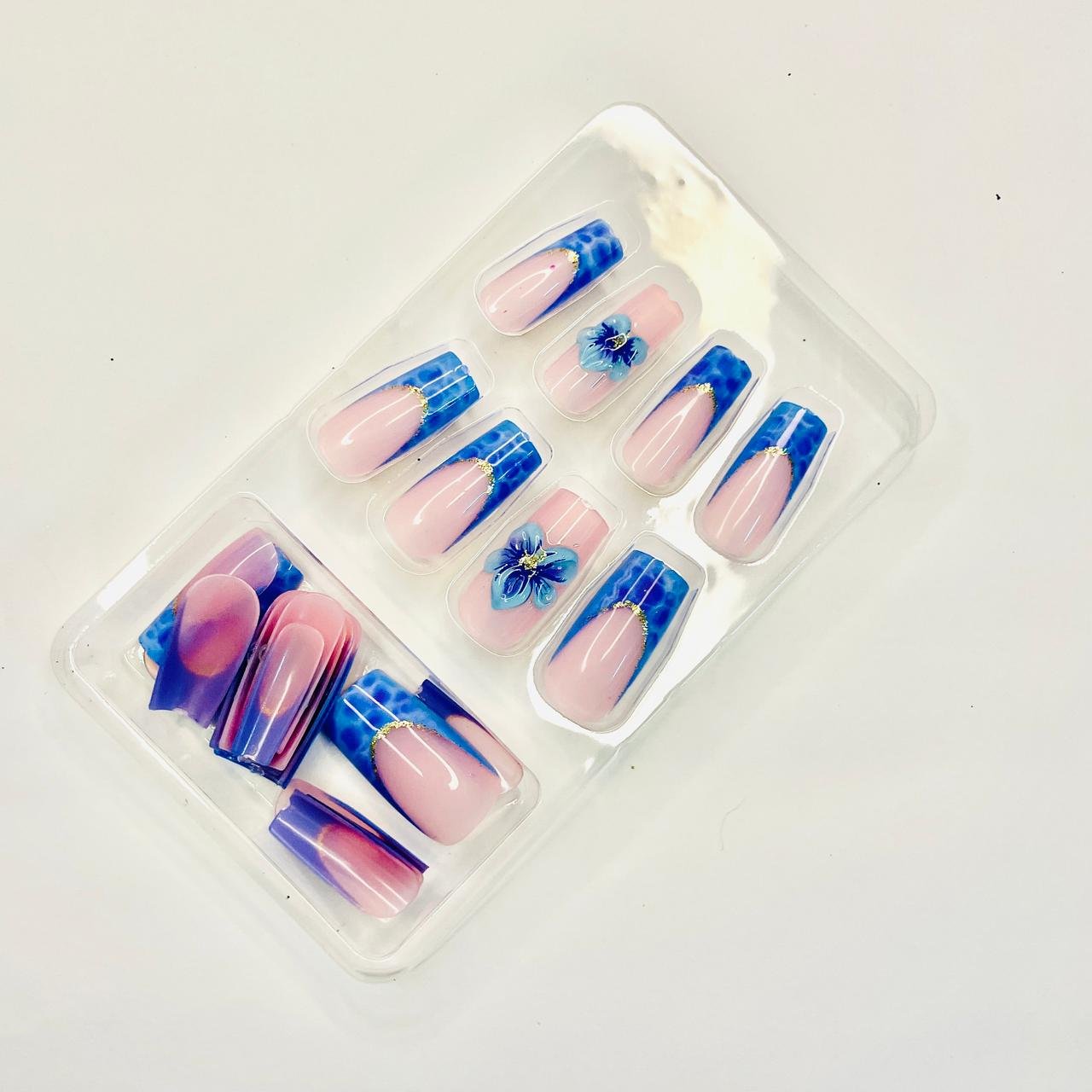 Reusable Nude Pink & Blue Marble 12 Pcs Nail set