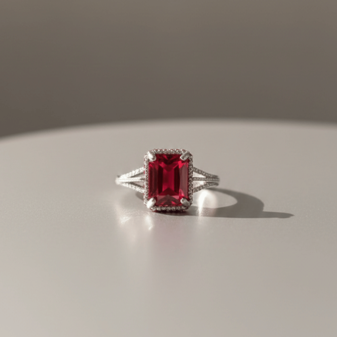 Emerald-cut ruby engagement ring with a halo setting and split shank band