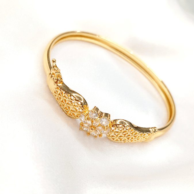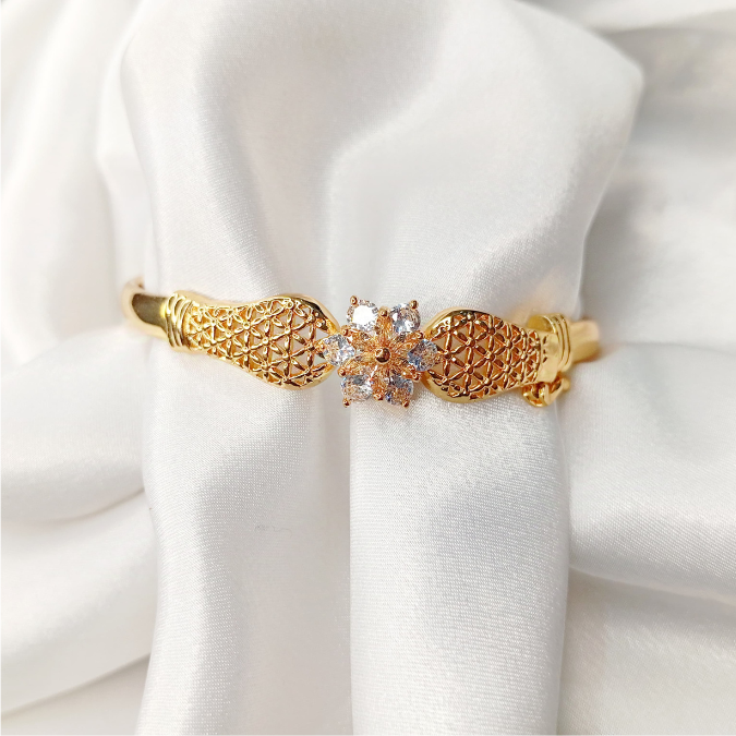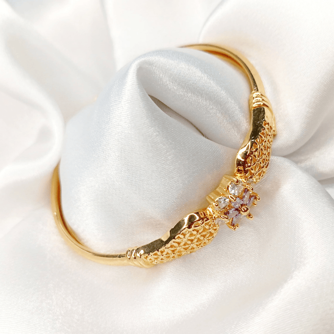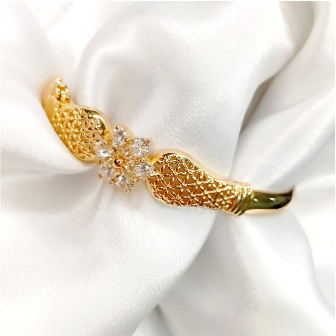 The Gold Plated Hand Kara features a stunning white and purple design, adding a vibrant and elegant touch to your wrist. Crafted with high-quality gold plating, it’s a perfect blend of luxury and style. Available now at StorebyNoor.
