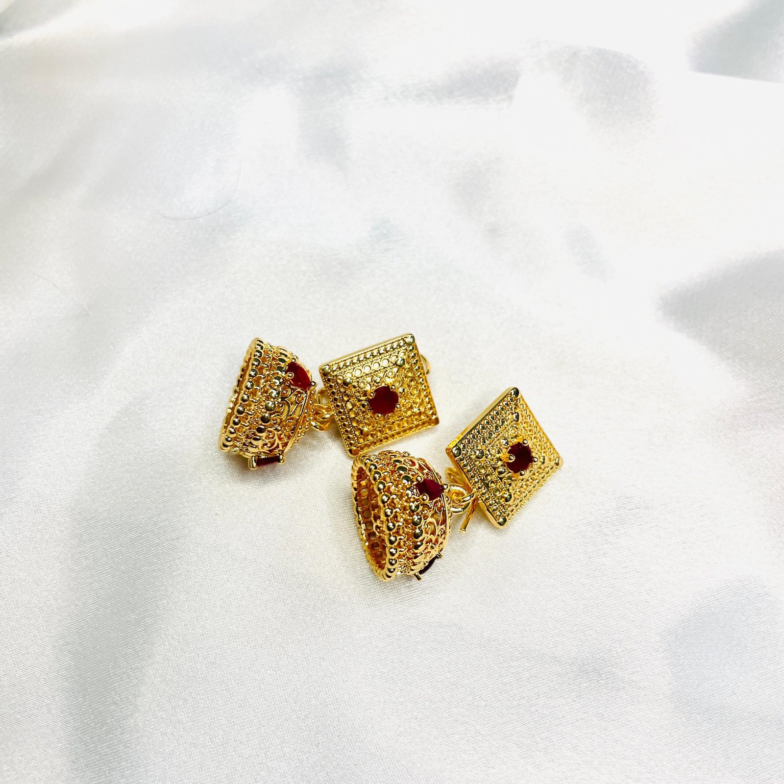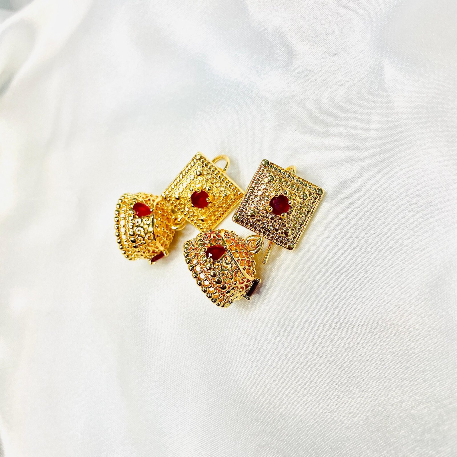 - Medium-sized gold-plated Bali earrings in maroon.