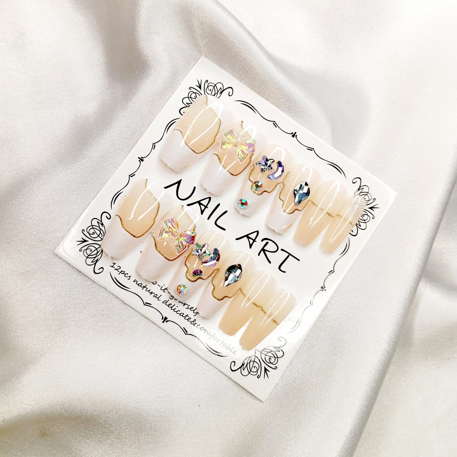 Nude Bow Orange Charms Artificial Nails with Accessories