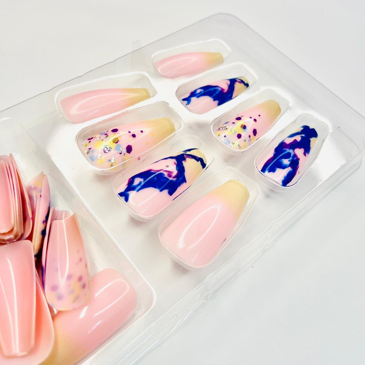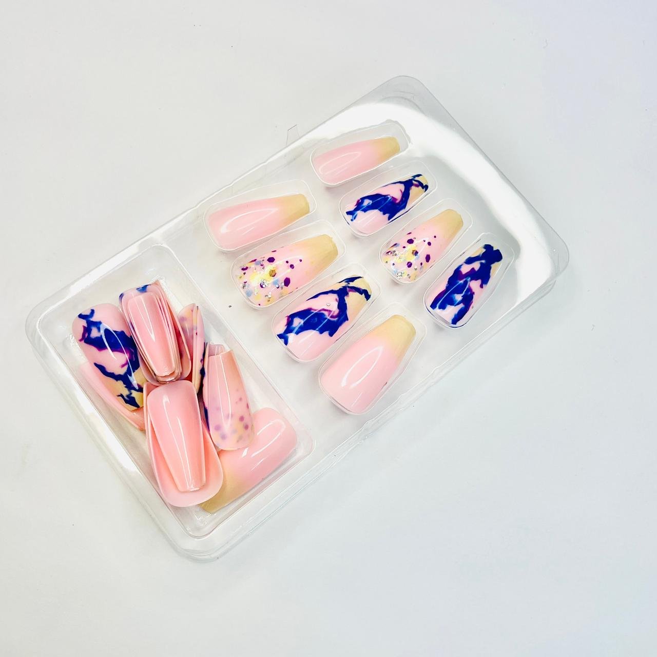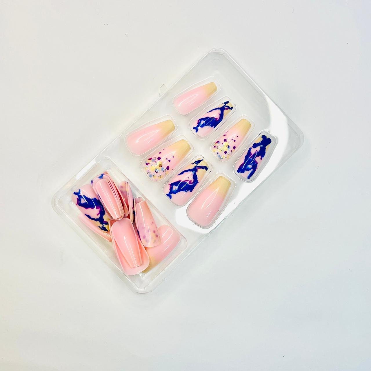 Reusable Nude Pink & Blue Marble 12 Pcs Nail set