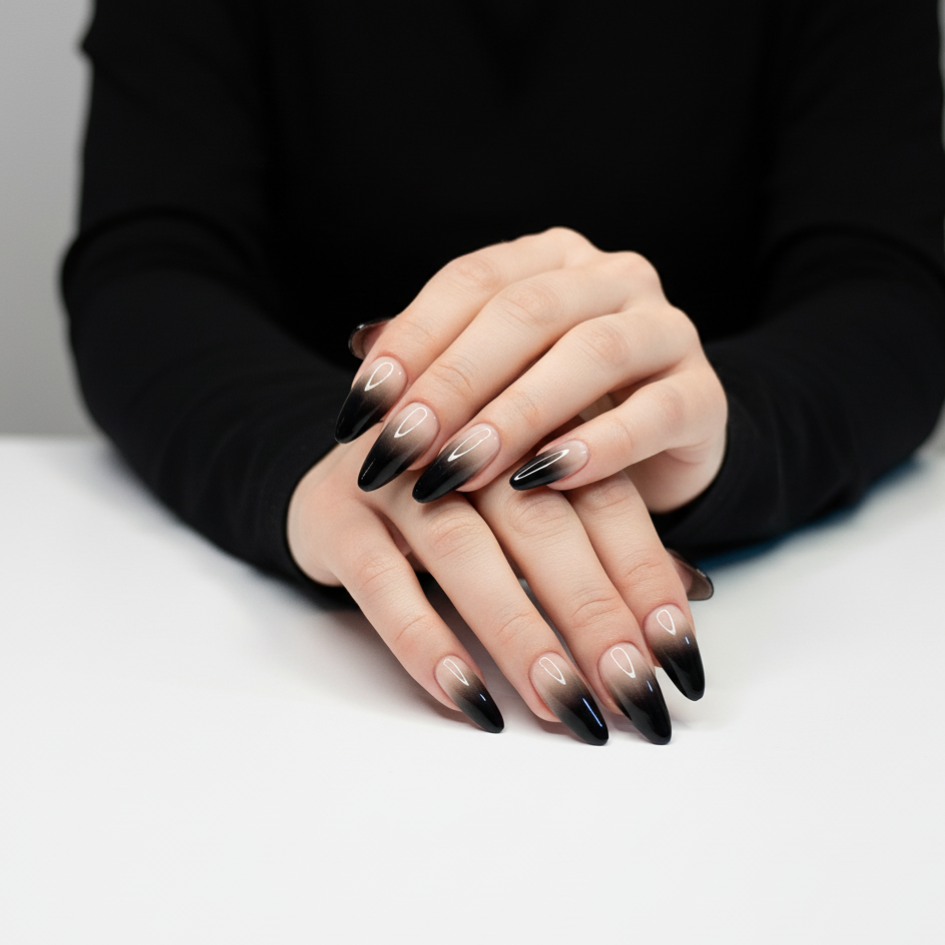 Achieve a sophisticated, high-contrast look with this Reusable Two-Shaded Black Press-On Nail Set (24 Pcs). These striking false nails feature a clever mix of black finishes (like glossy and matte) or a subtle dual-tone design, offering an instantly edgy and luxurious manicure. Durable, easy to apply, and the 24-piece set ensures a perfect, salon-quality fit every time.