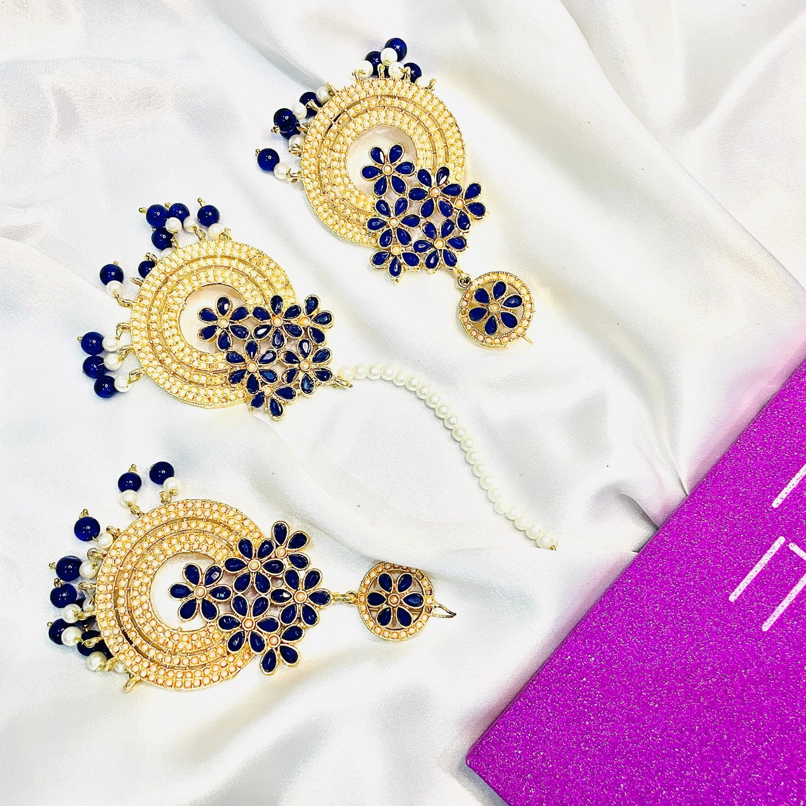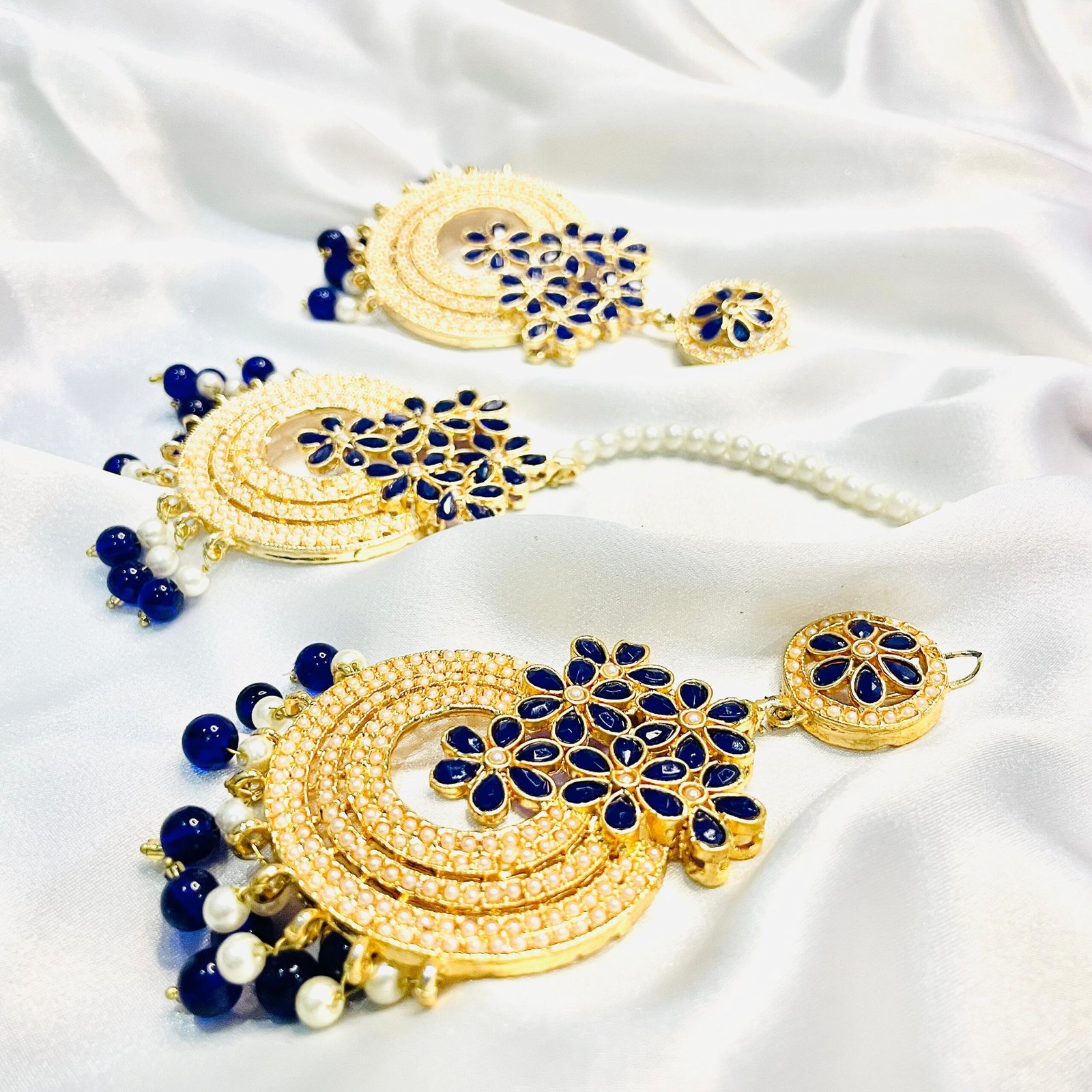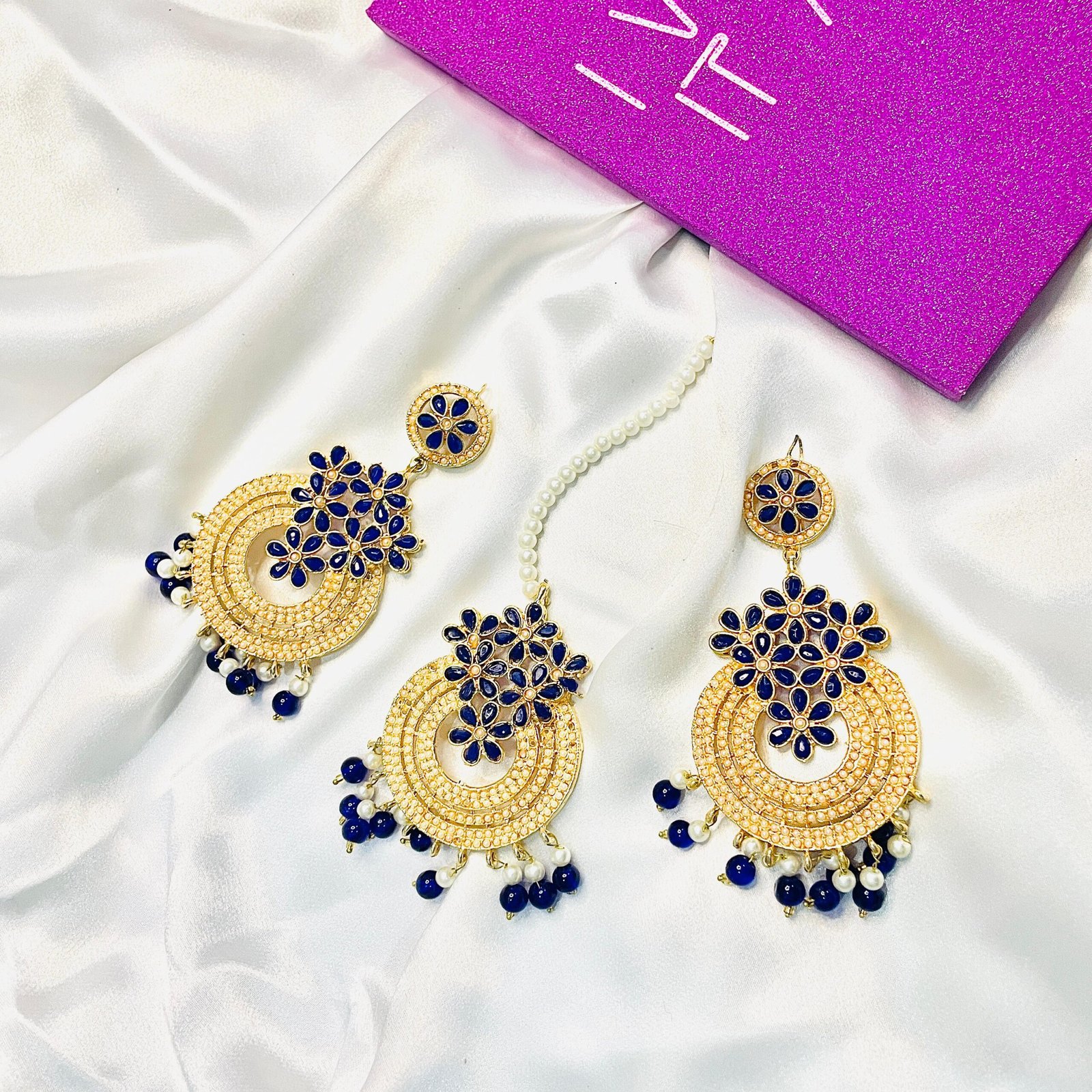 - Royal Blue Chand Bali and Tikka set with intricate detailing.