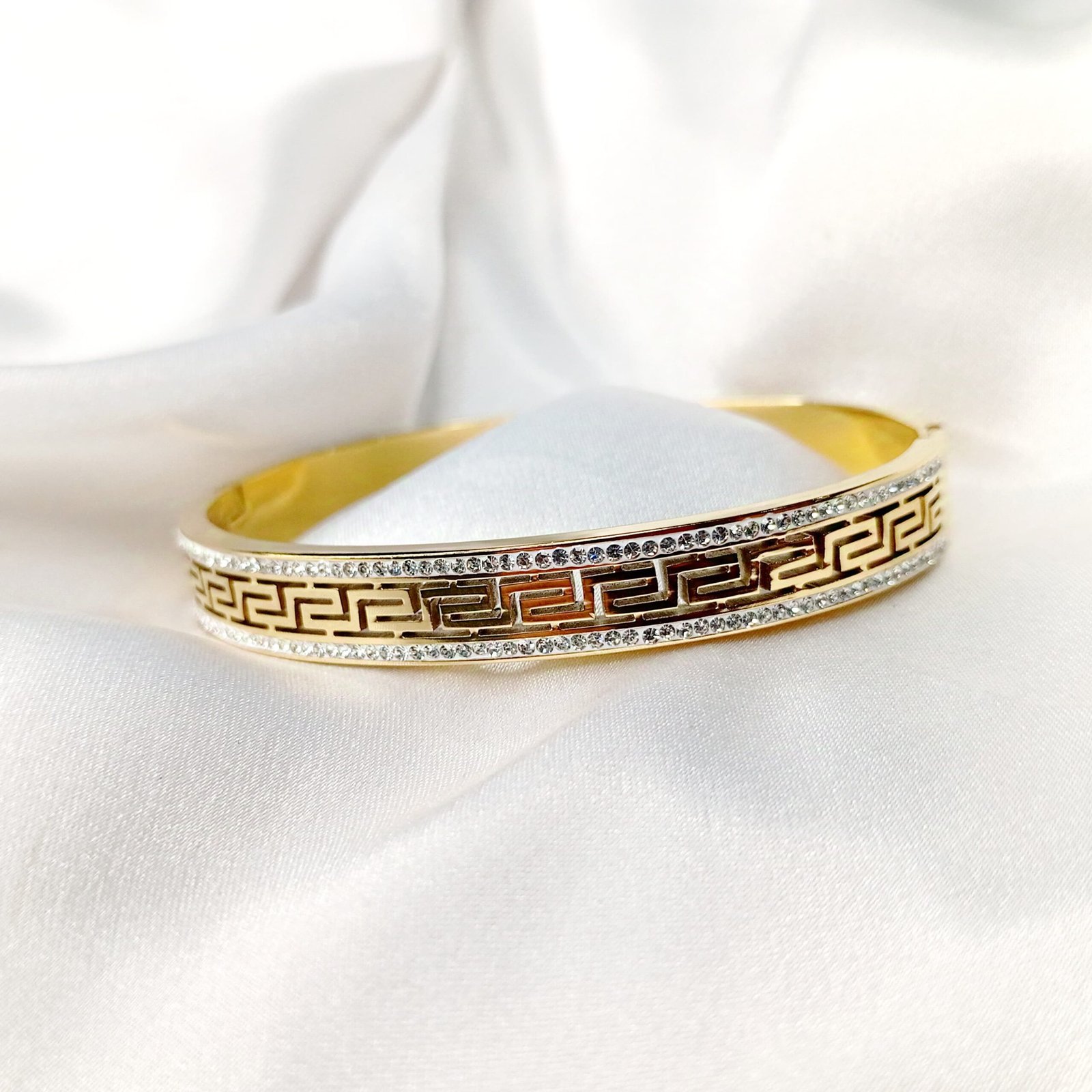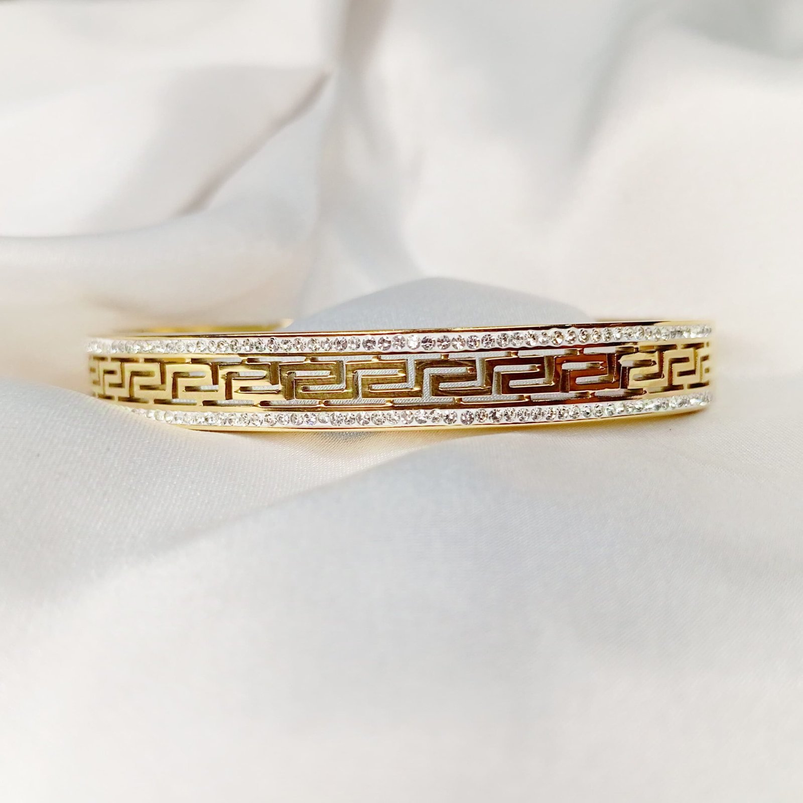 The Sequence Micro Pattern Zircon Stainless Steel Handcuff is a non-tarnished, water-resistant accessory perfect for women in Pakistan seeking elegance and practicality.